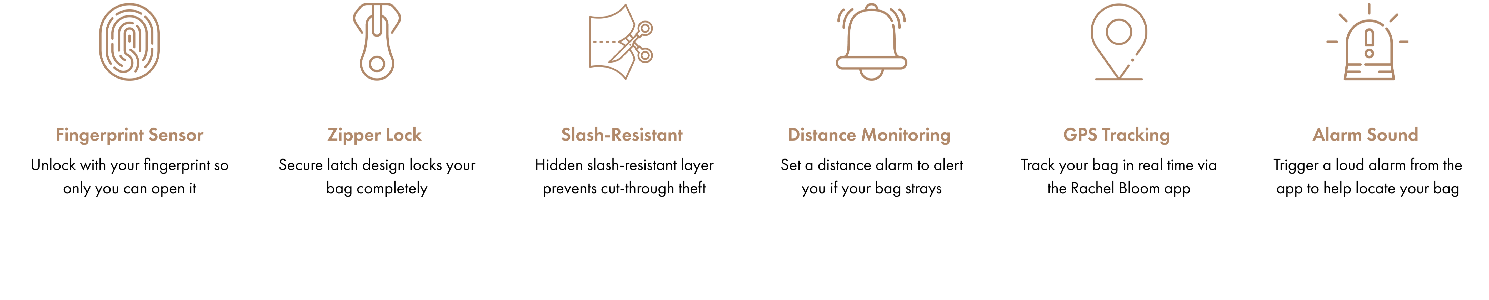 Unlock your bag remotely with the Rachel Bloom app. Whether you’re across the room or on the go, secure access is always in your hands.Cut-Resistant Security Layer