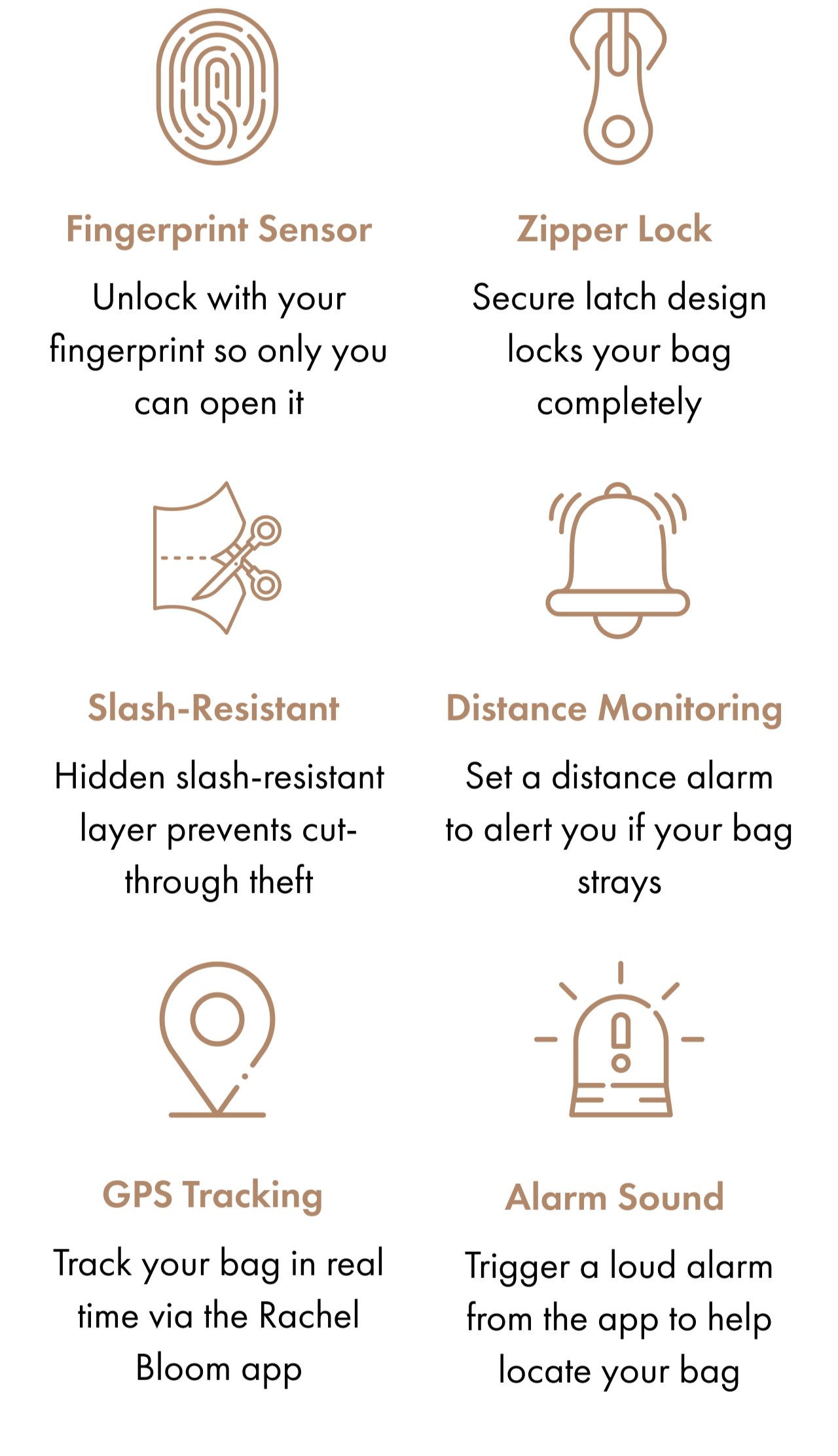 Unlock your bag remotely with the Rachel Bloom app. Whether you’re across the room or on the go, secure access is always in your hands.Cut-Resistant Security Layer